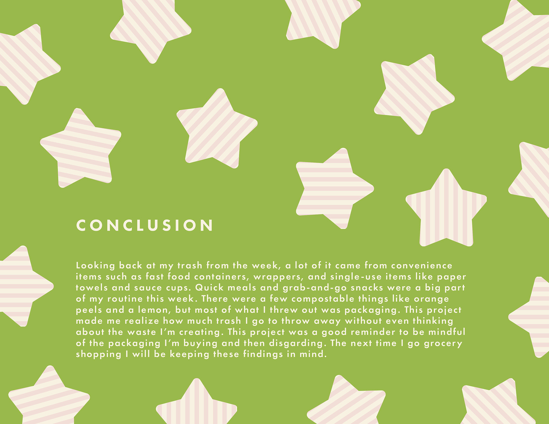 This project is a week-long study of my personal trash output, where I tracked everything I threw away and translated that information into a visual identity system. Each item was categorized by material, usage, and method of disposal, allowing patterns to emerge through the design rather than just the data. As the system came together, it became clear how much of my waste came from convenience items like food packaging, paper towels, and other single-use products, compared to the relatively small amount of compostable waste. The presentation uses clear hierarchy and consistent visual language to turn everyday trash into something readable and reflective. Overall, this project uses design as a way to make routine habits more visible and to encourage greater awareness of how small choices contribute to waste.