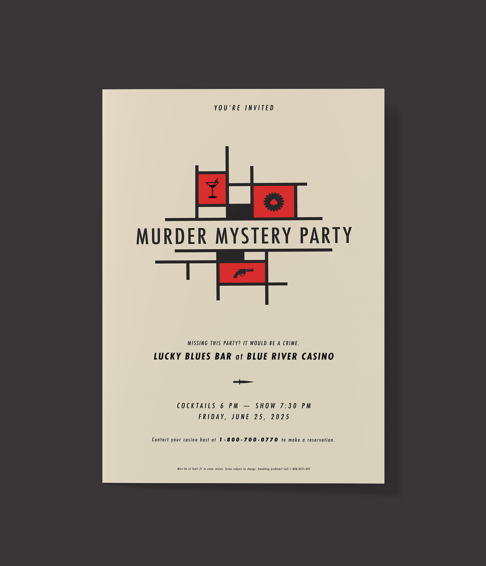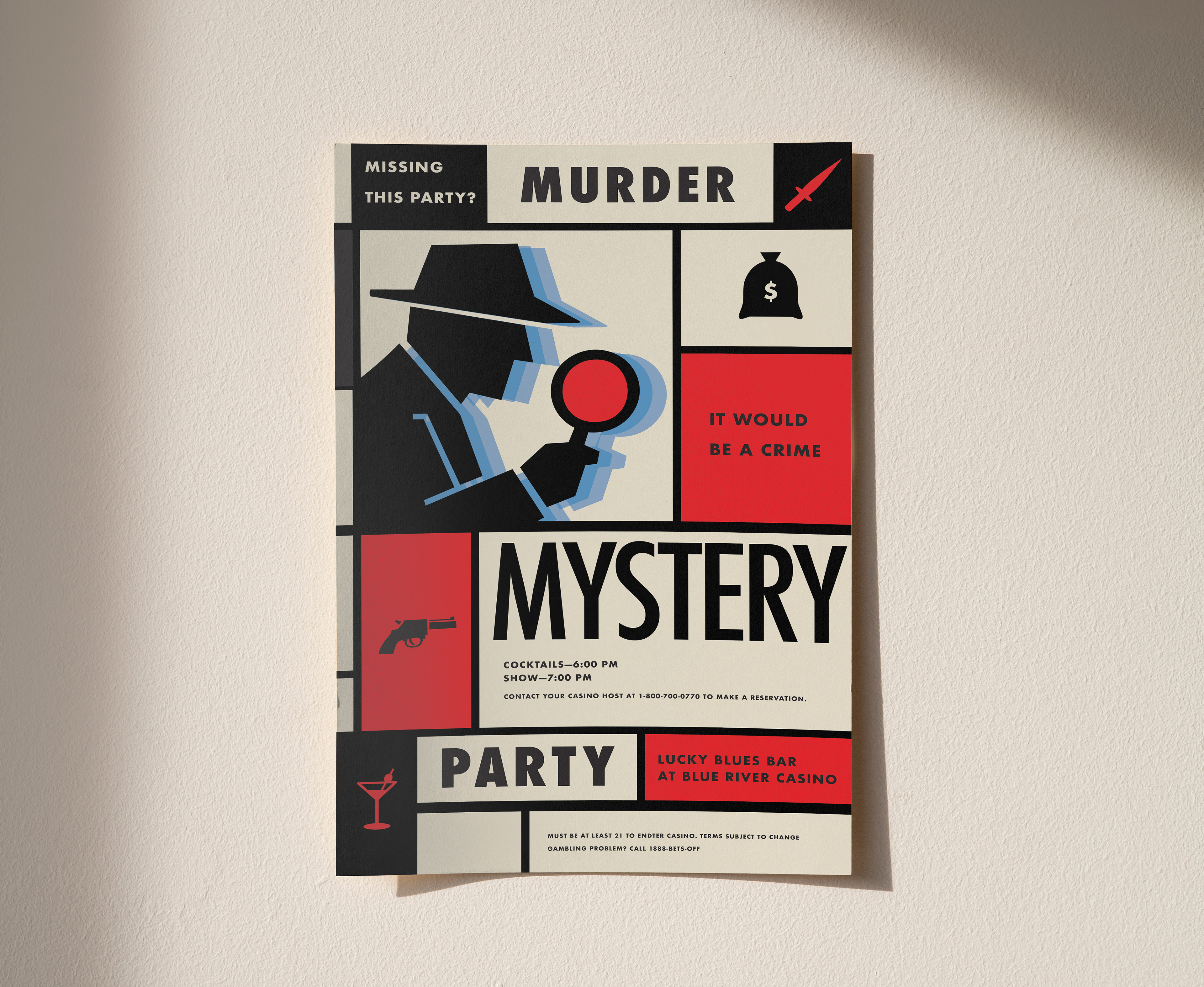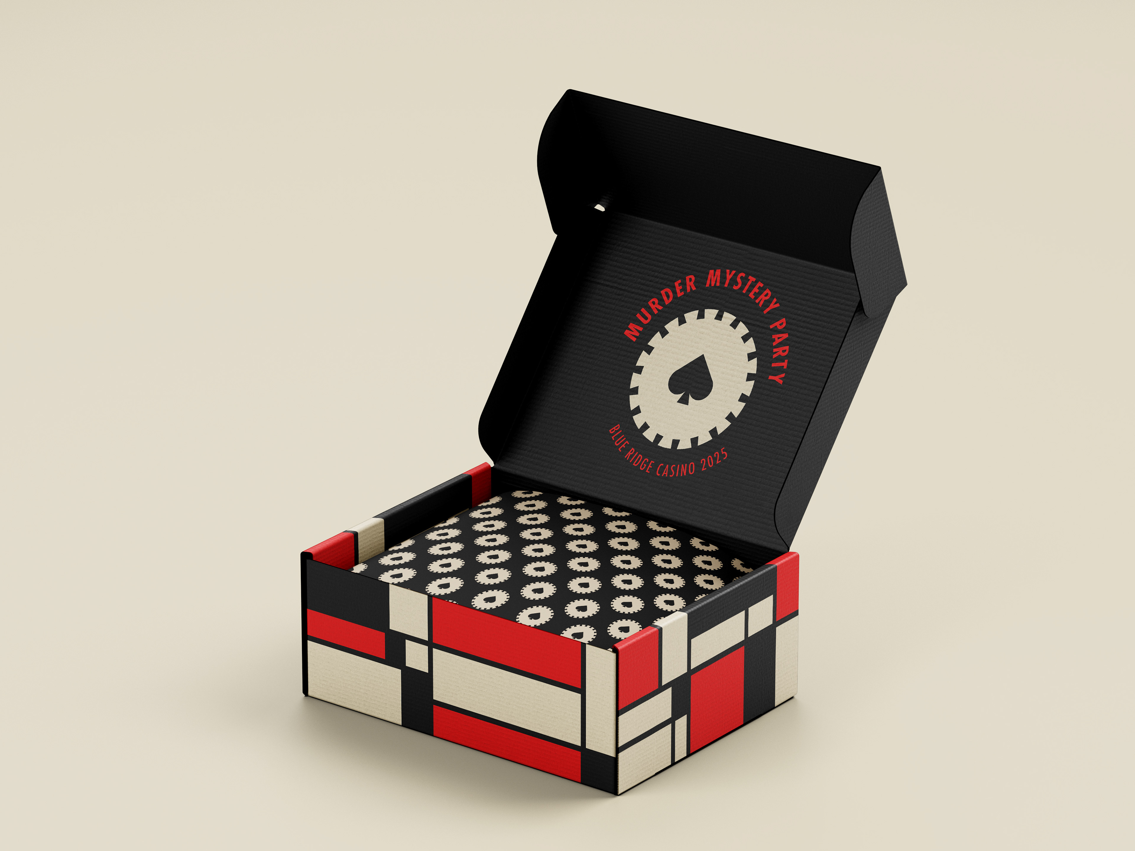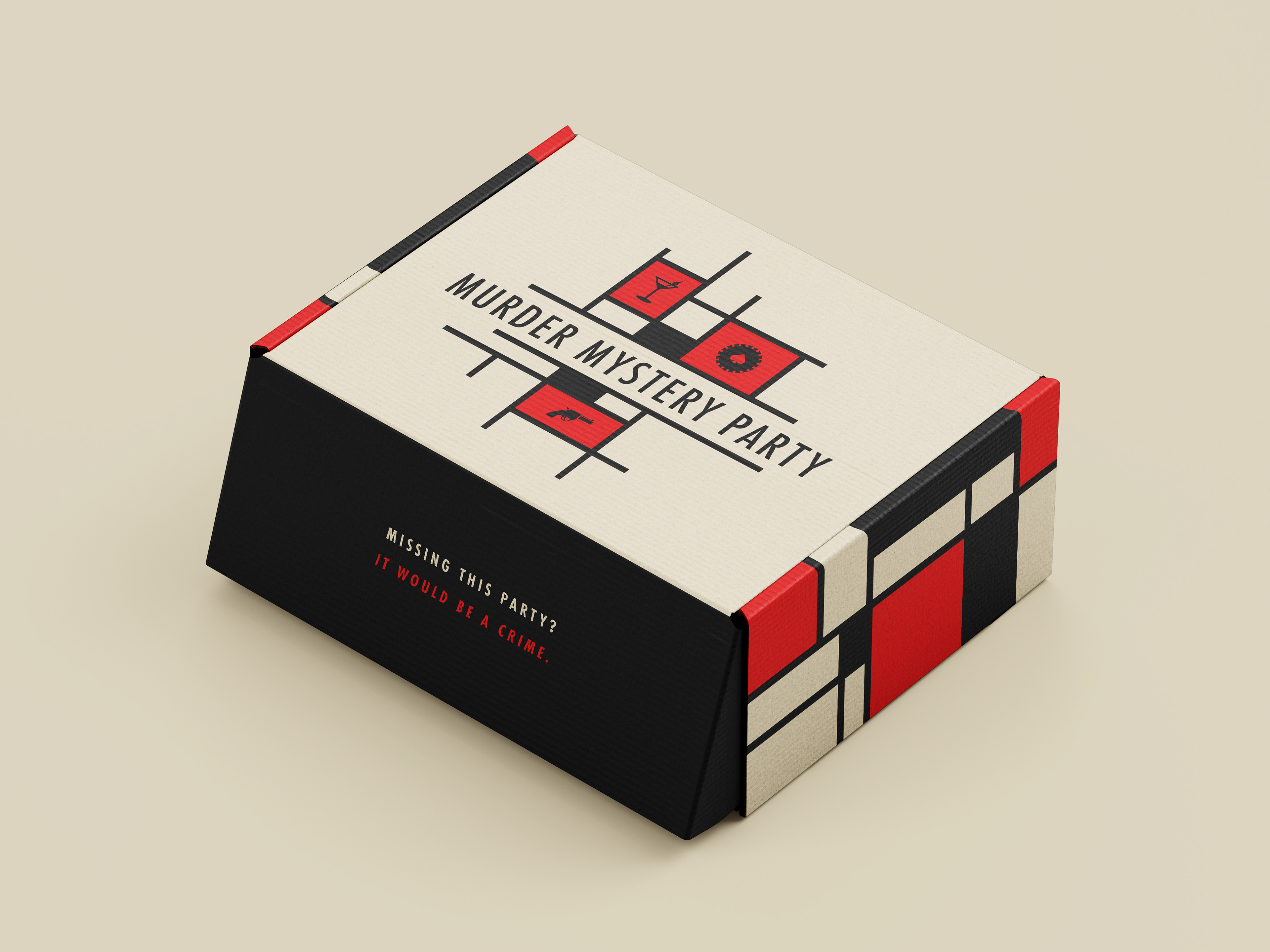 This event brand identity draws inspiration from classic noir and mid-century crime graphics. The visual system uses bold geometric layouts, a limited color palette, and iconic imagery—such as detectives, weapons, and clues—to set a playful yet suspenseful tone. Strong typography and modular blocks allow the identity to flex across posters, invitations, and event materials while staying cohesive and instantly recognizable. The overall design balances mystery and fun, inviting guests into an immersive, story-driven experience before the event even begins.