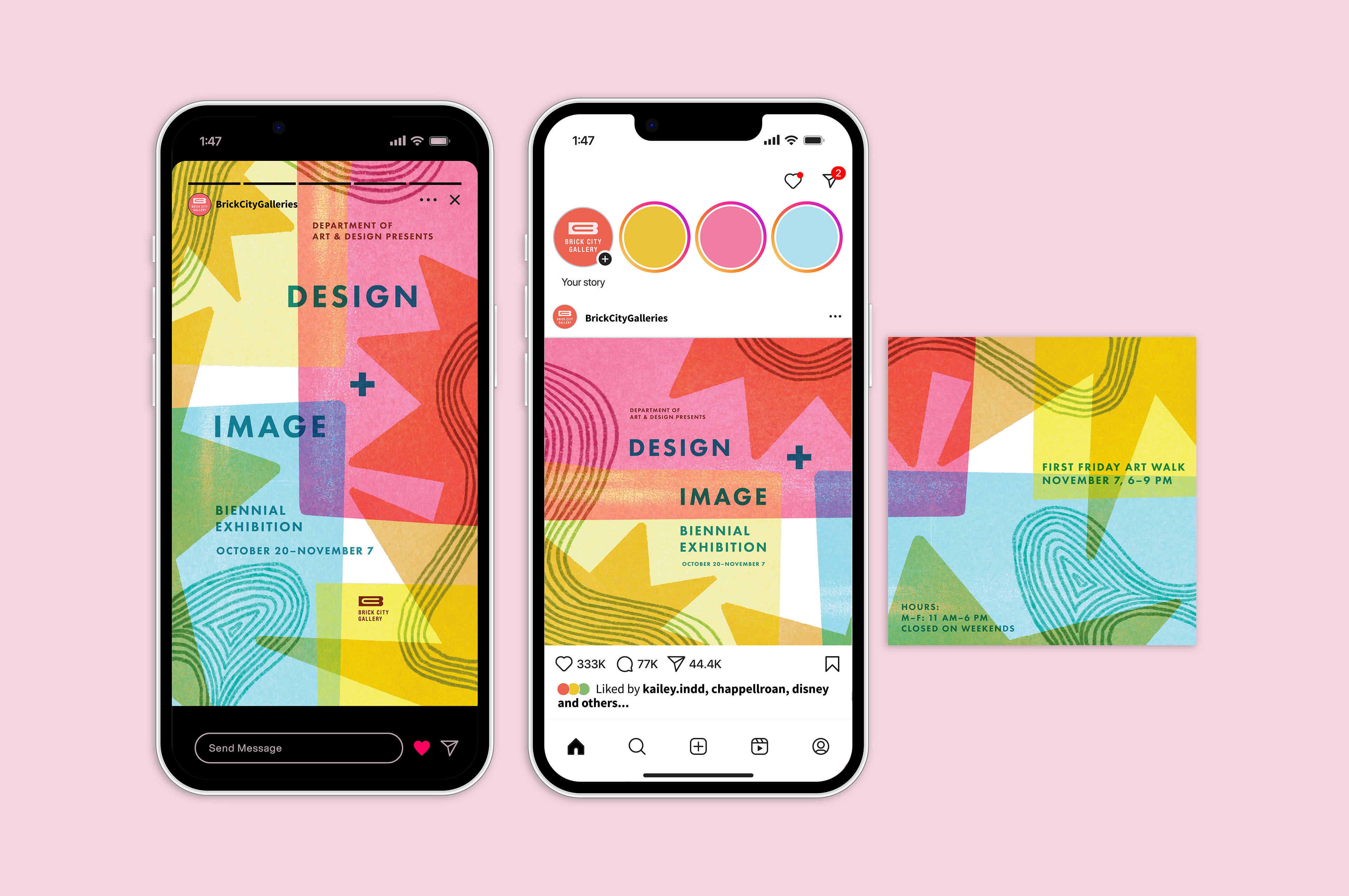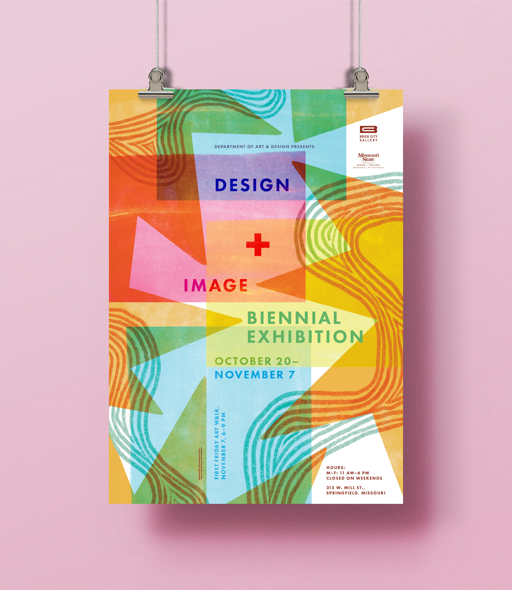 This poster was selected as one of two official promotional pieces for Missouri State University’s Biennial Design + Image Exhibition. The design focuses on the intersection of design and image through layered geometric forms, expressive textures, and a vibrant, overlapping color palette that creates movement and visual energy.