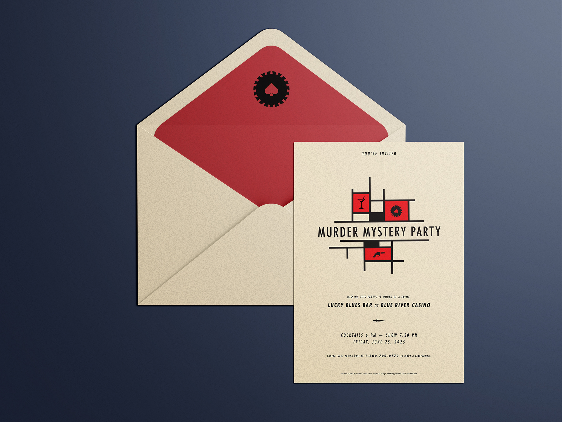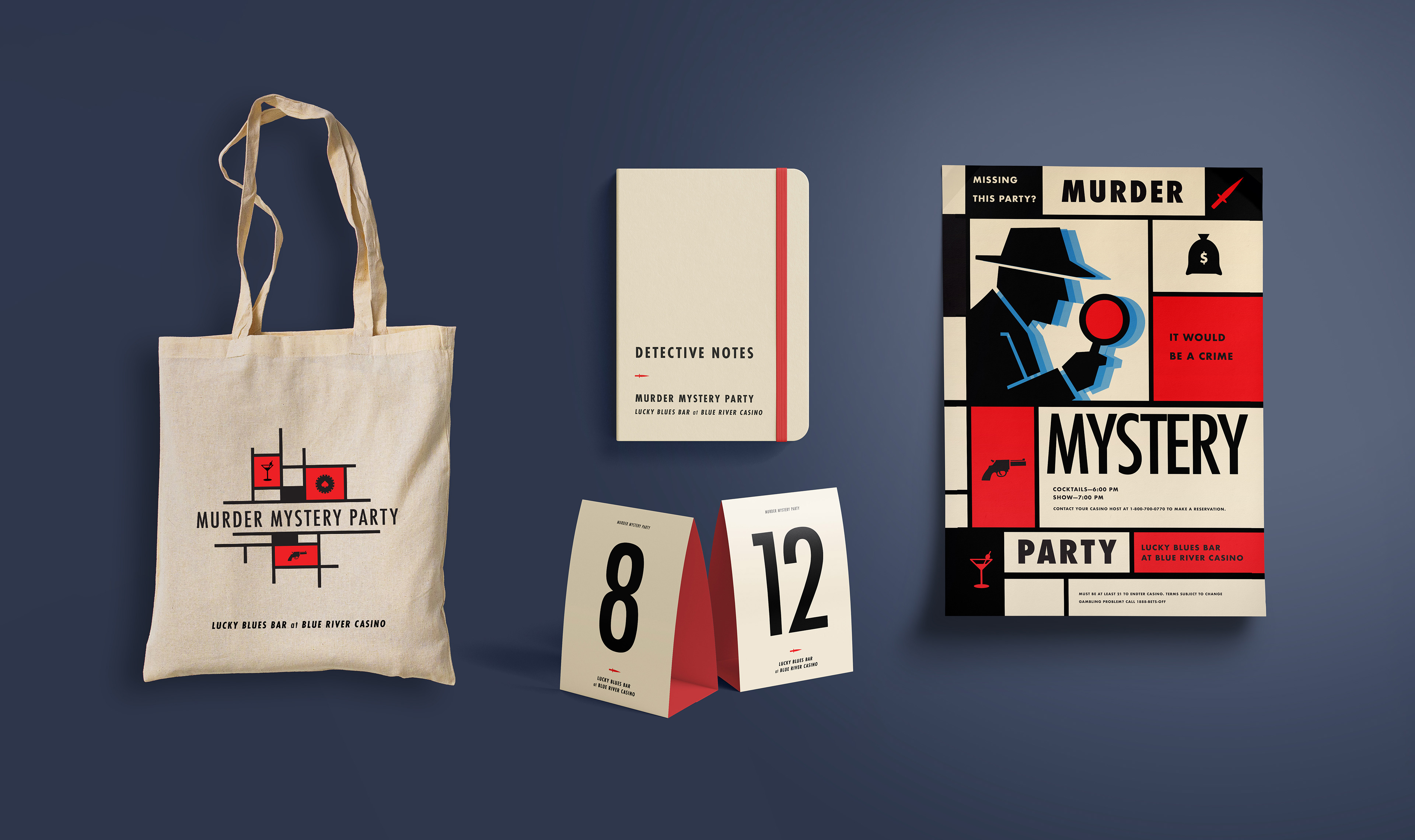The brief for this collaborative project with my colleague Megan Sanders was to create event materials to be mailed as an invitation to Blue River Casino’s Murder Mystery Party, including a custom invitation box. To convey the tone of the night, I used a combination of De Stijl and classic film noir imagery.