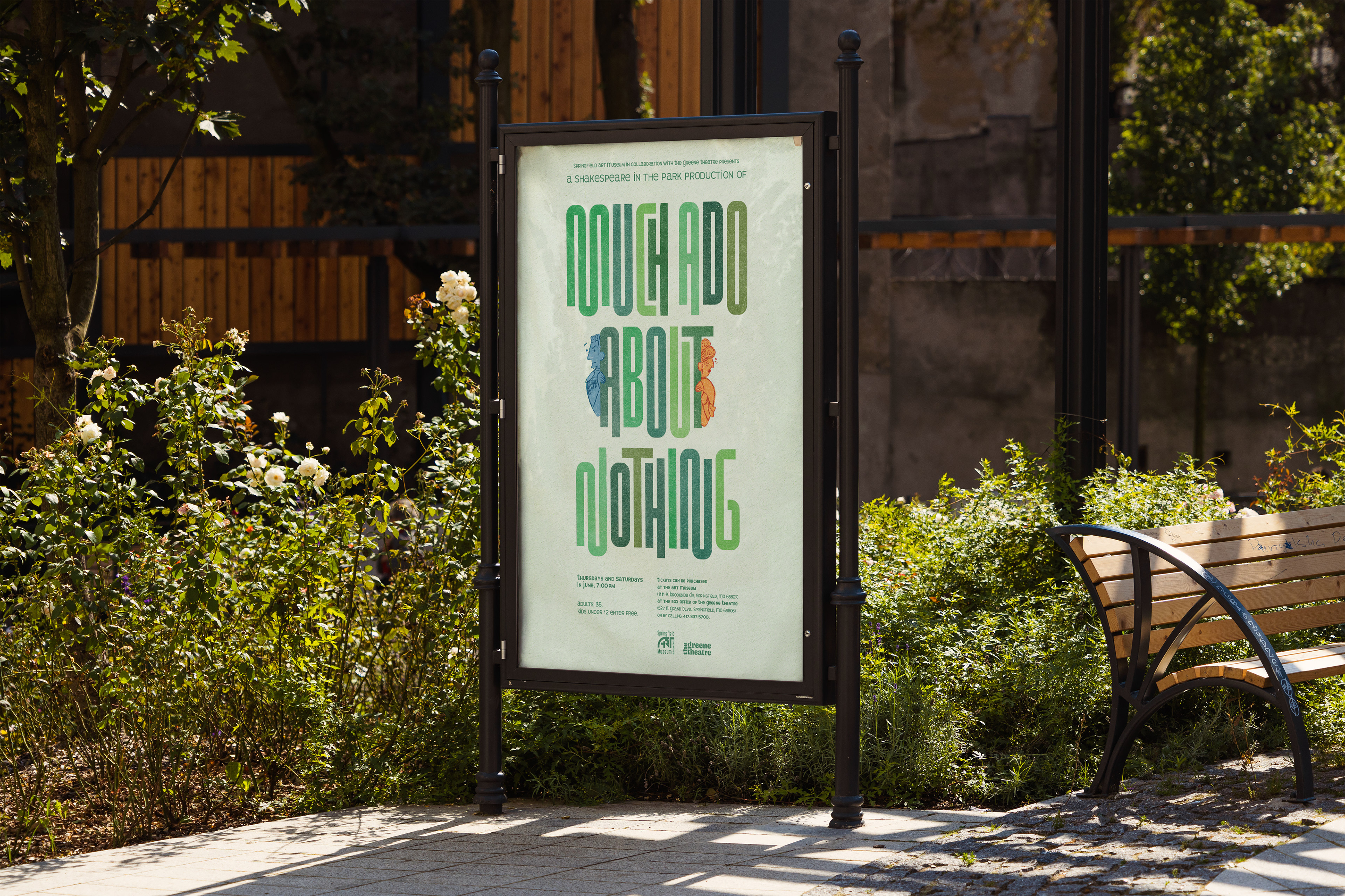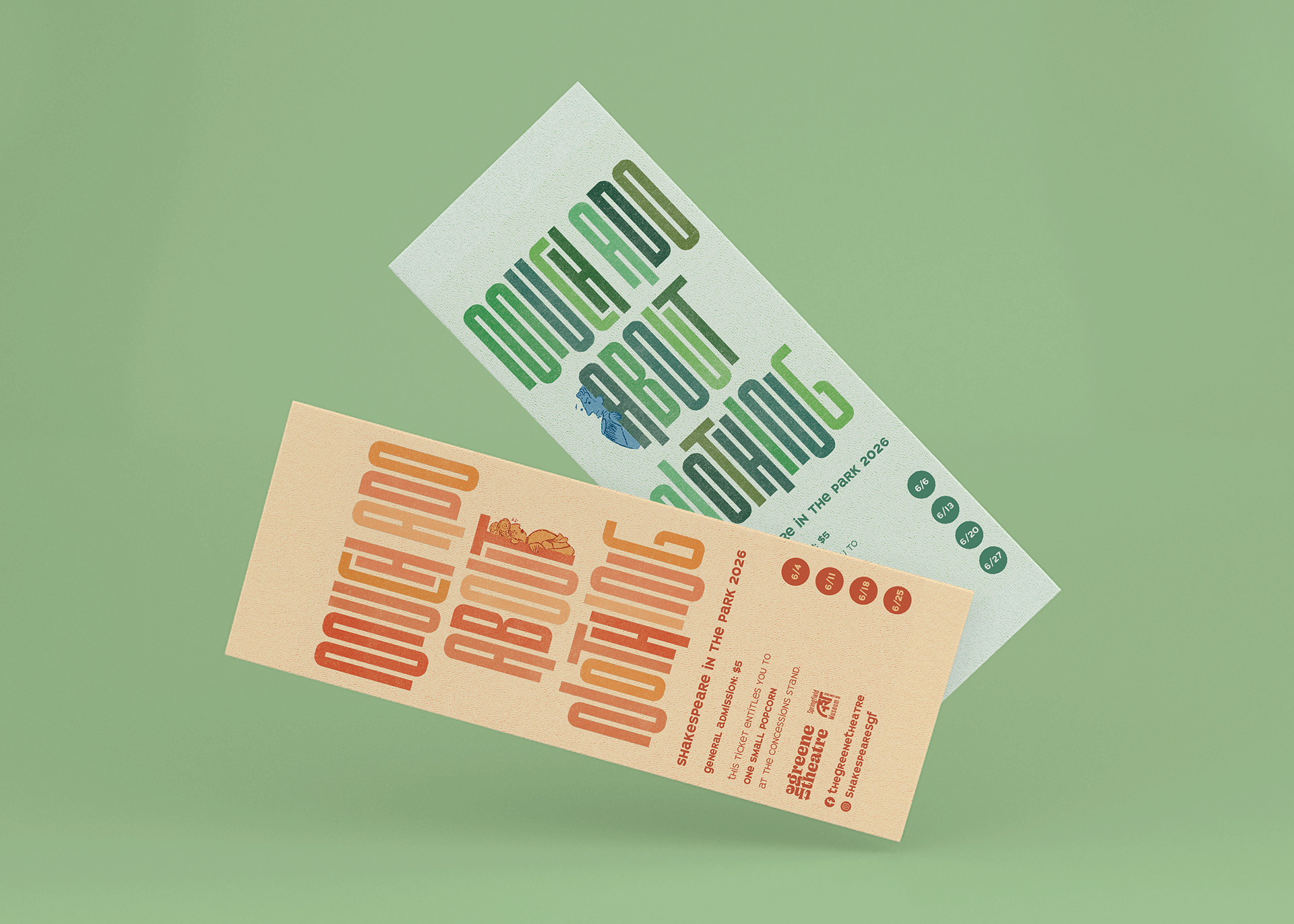This project consists of event materials designed for Shakespeare in the Park’s Summer 2026 season. The custom title typography is inspired by two characters eavesdropping in a hedge maze, a visual reference that reflects the play’s themes of secrecy, miscommunication, and overheard conversations. The brochure was created to function both as a promotional piece and as a keepsake for audiences attending Much Ado About Nothing. The front of the brochure presents the full summer lineup with bold type and a cohesive green palette that evokes an outdoor setting. When unfolded, the reverse side shifts focus to Much Ado About Nothing, allowing the brochure to live on as a show memento.